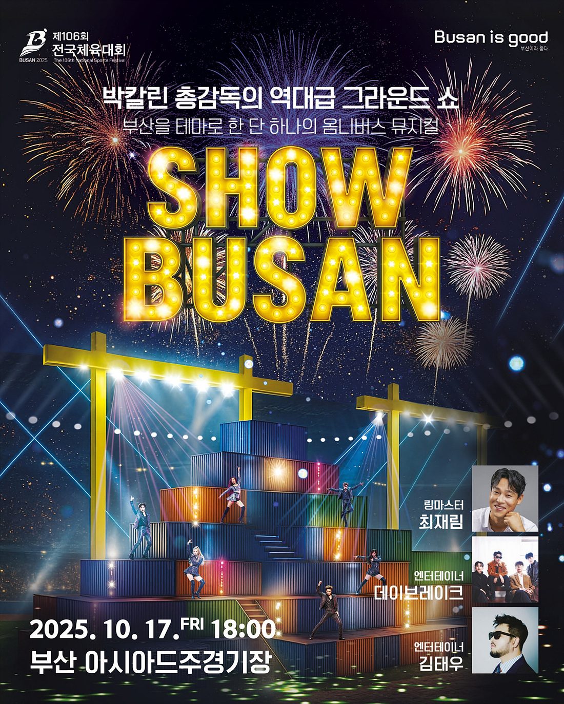 ■ 행사 : 제106회 전국체육대회 개회식 – SHOW BUSAN ■ 일시 : 2025년 10월 17일(금) 18:00 ■ 장소 : 부산 아시아드주경기장 ■ 총감독 : 박칼린 ■ 출연진 : 최재림, 데이브레이크, 김태우 외 ■ 자세히보기 : https://busan.go.kr/106_sports/pages/sub/sub05/sub05_details1.html?id=33 |