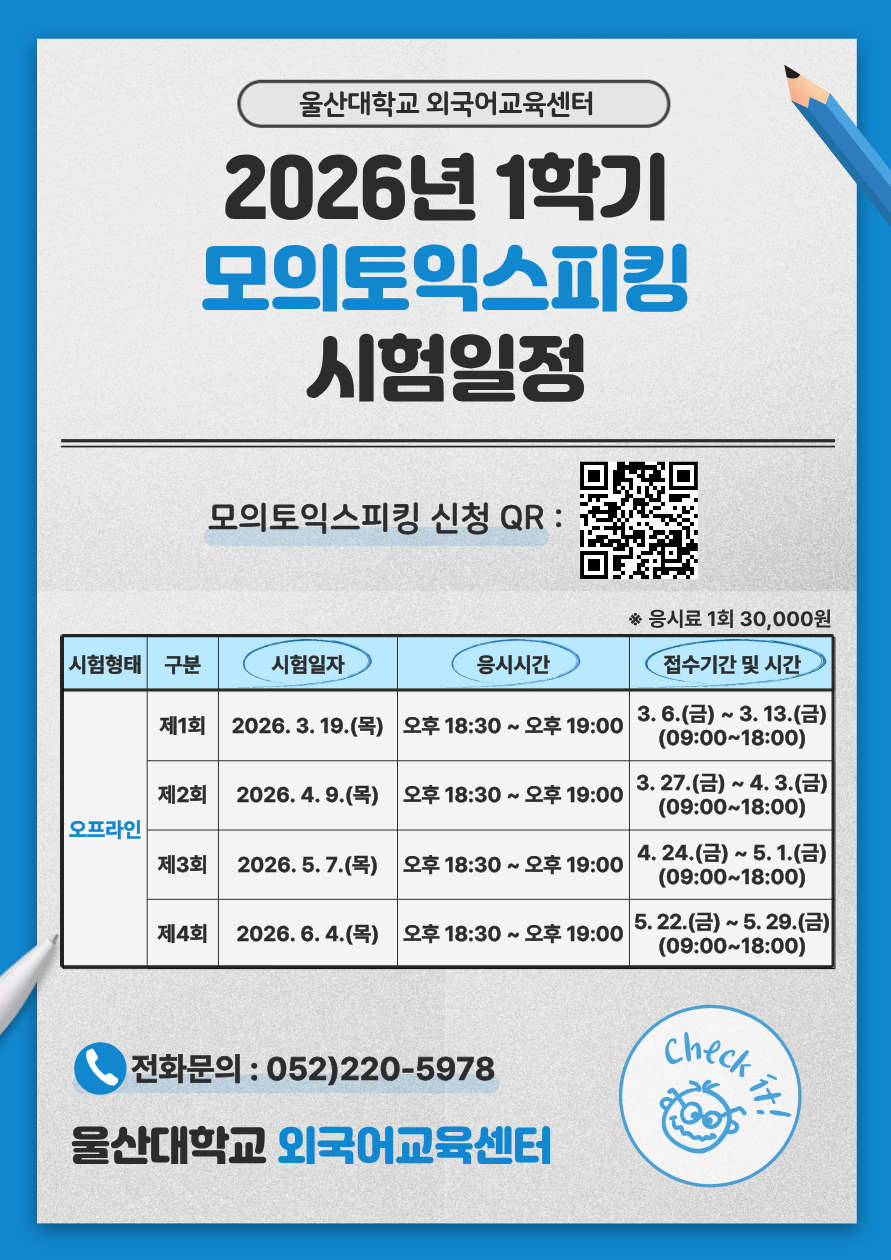 외국어교육센터에서는 본교생들의 외국어 능력 향상 및 취업 경쟁력 강화를 위해 학기 중에도 모의 토익스피킹 시험을 확대 운영하고 있습니다. 관심 있는 학생들의 많은 참여 바랍니다. * 시험 개요